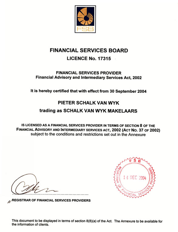 Schalk van Wyk Makelaars is by die Financial Services Board (FSB) geregistreer as 'n gemagtigde finansiële dienste verskaffer met lisensie nommer 17315. Schalk van Wyk is 'n onafhanklike versekeringsmakelaar en is in die bedryf vanaf 1982. My kantoor is gestasioneer in Bloemfontein.